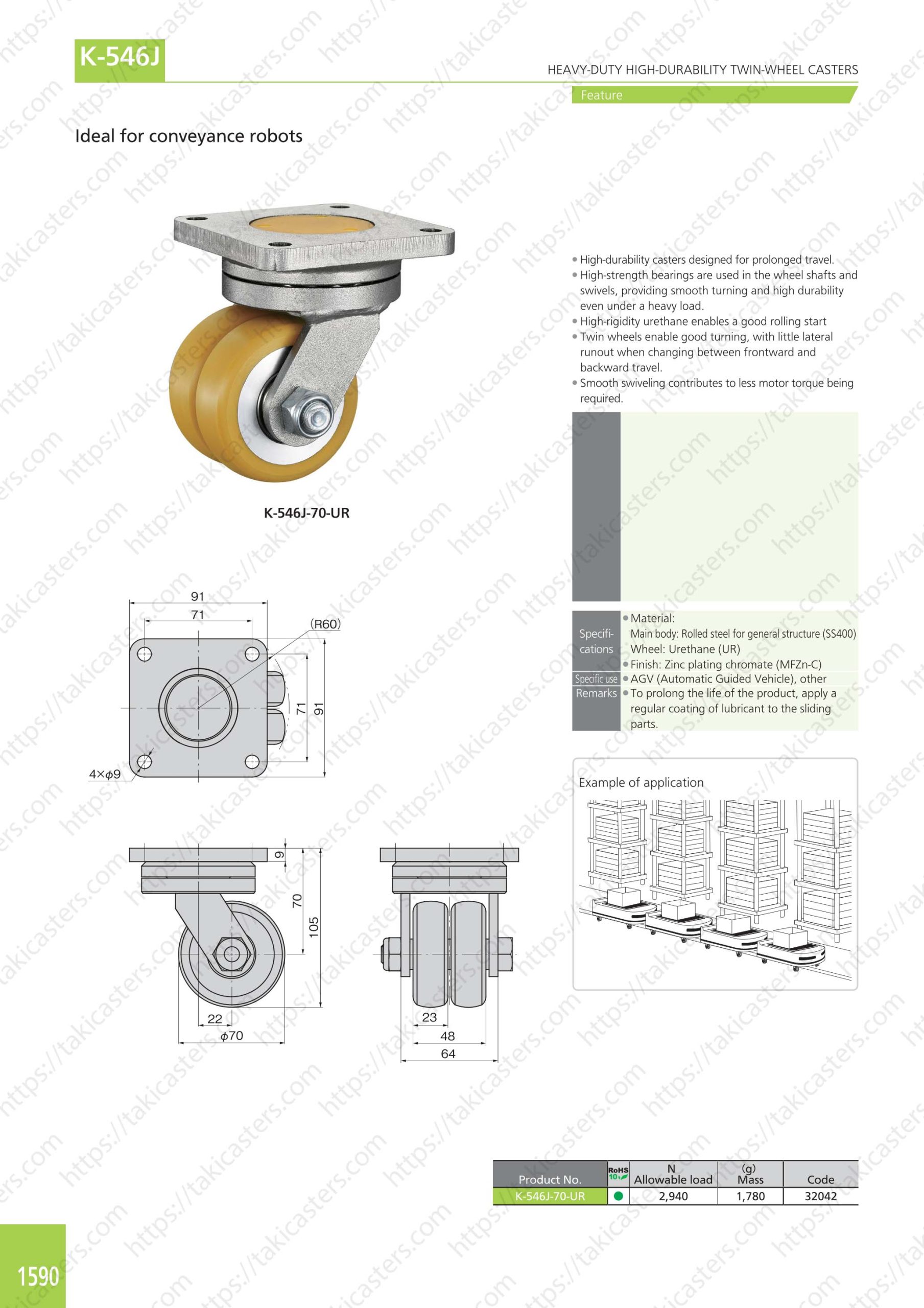 ●K-546J-70-UR :Bánh xe xoay/bánh xe urethane φ70 (tải trọng cho phép 2940N), chiều cao 105 mm.