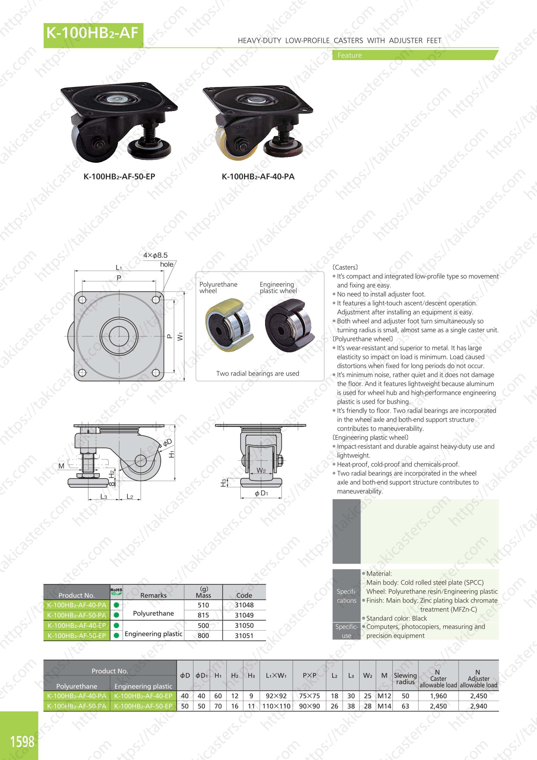 ●K-100HB2-AF-50-EP: Bánh xe nhựa kỹ thuật φ50 (tải trọng cho phép 2450N). Chiều cao 70 mm.
