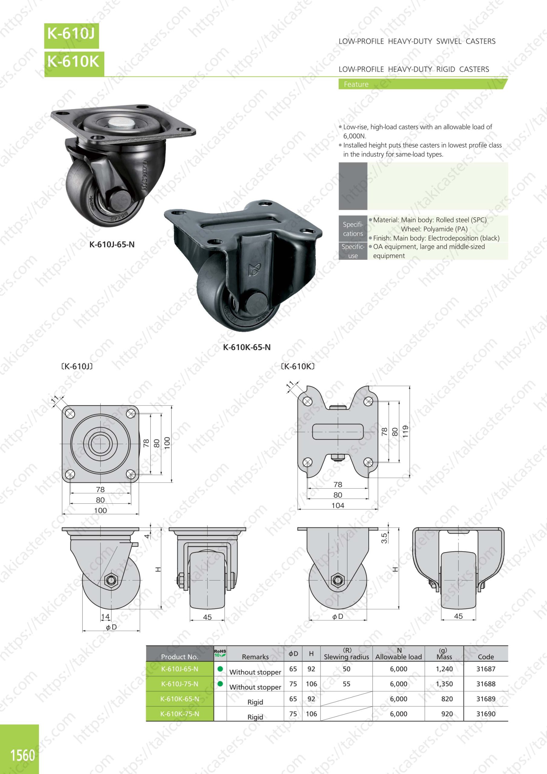 ●K-610J-65-N :Bánh xe xoay/bánh xe polyamit φ65 (tải trọng cho phép 6000N), chiều cao 92 mm.
