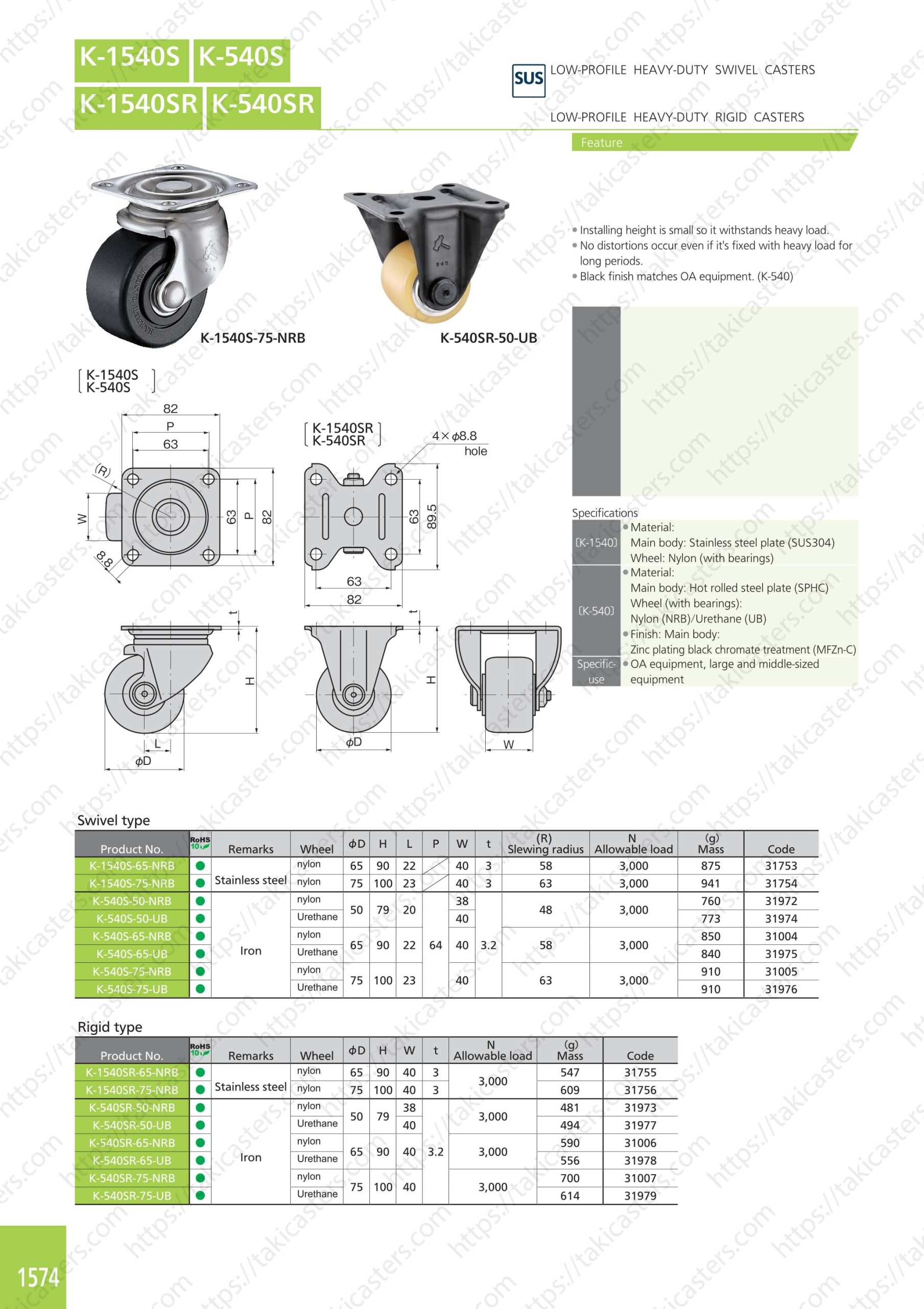 ●K-540S-65-NRB :Bánh xe xoay/bánh xe polyamit φ65 (tải trọng cho phép 3000N), chiều cao 90 mm