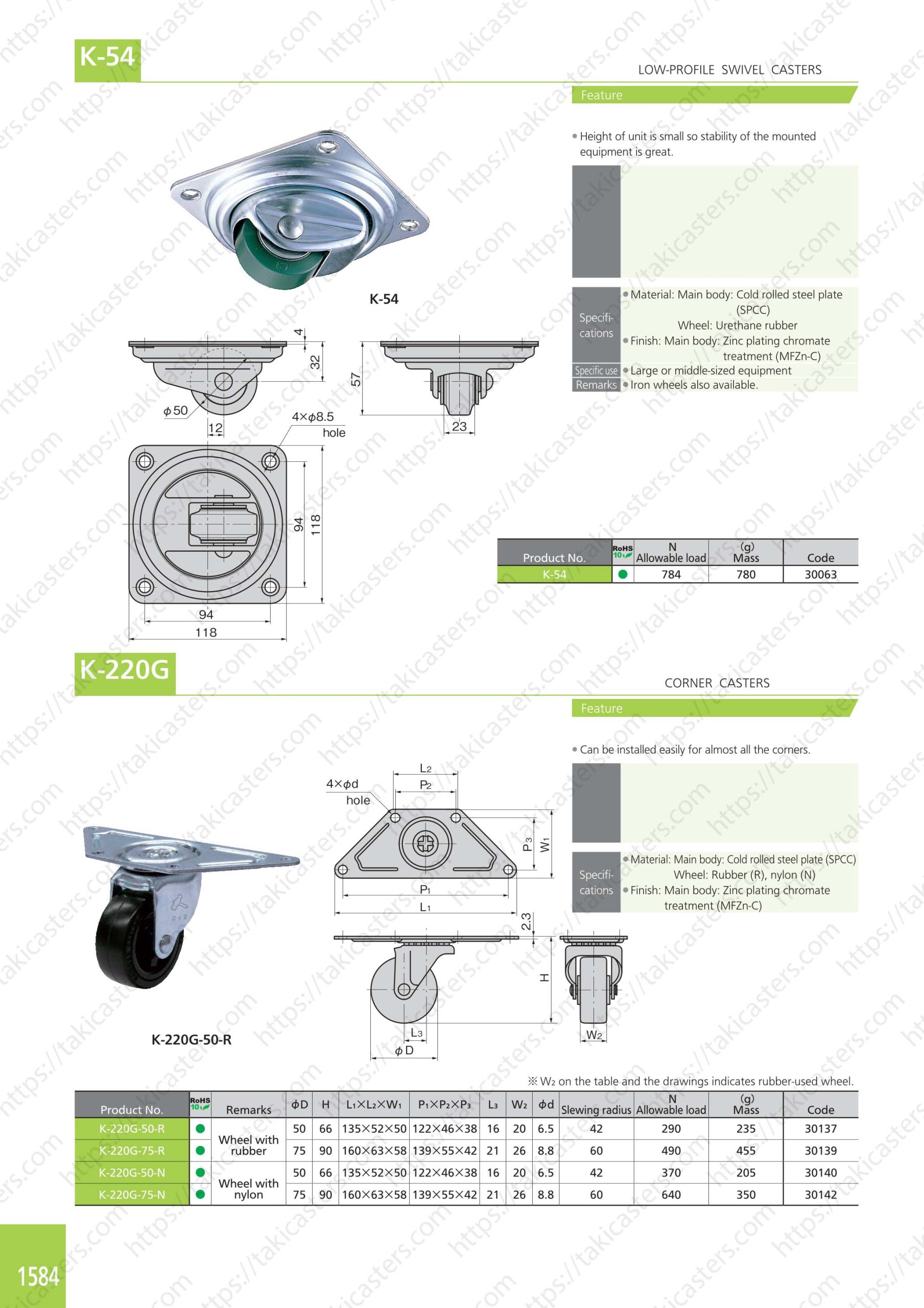 ●K-548 :Bánh xe xoayh/bánh xe cao su urethane φ50 (tải trọng cho phép 784N), chiều cao 57 mm.