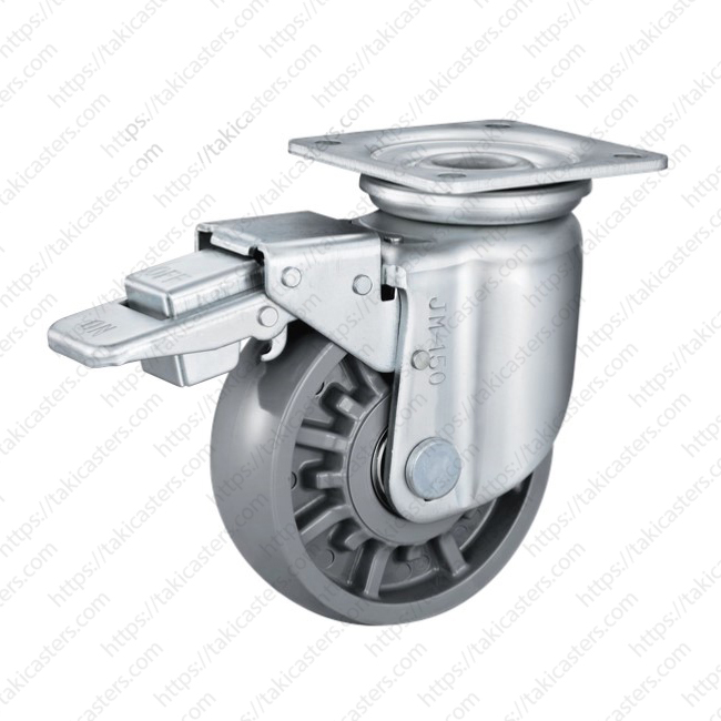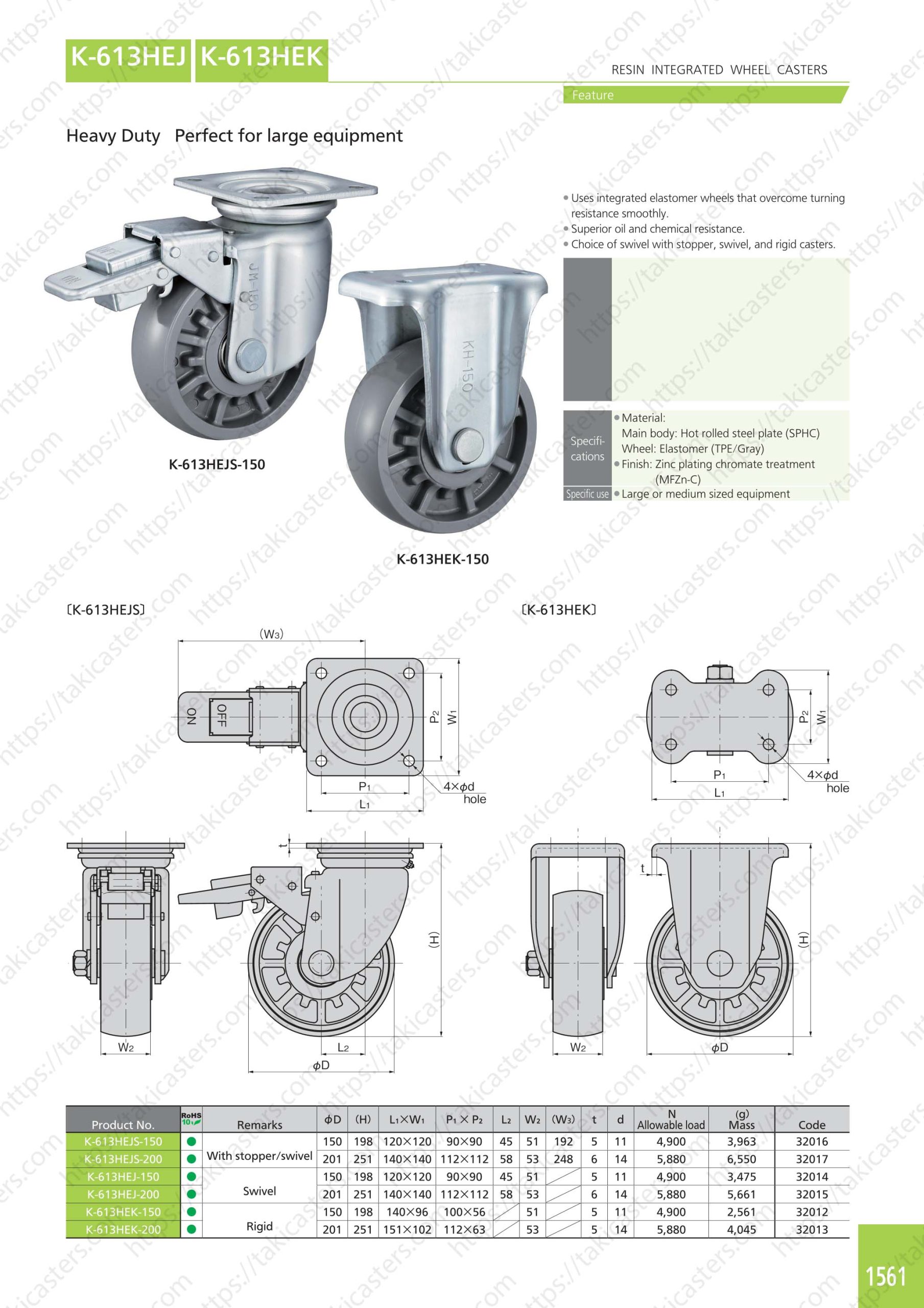●K-613HEJS-150 : Bánh xe xoay (có khóa) / Bánh xe đàn hồi φ150 (tải trọng cho phép 4900N), chiều cao 198 mm.