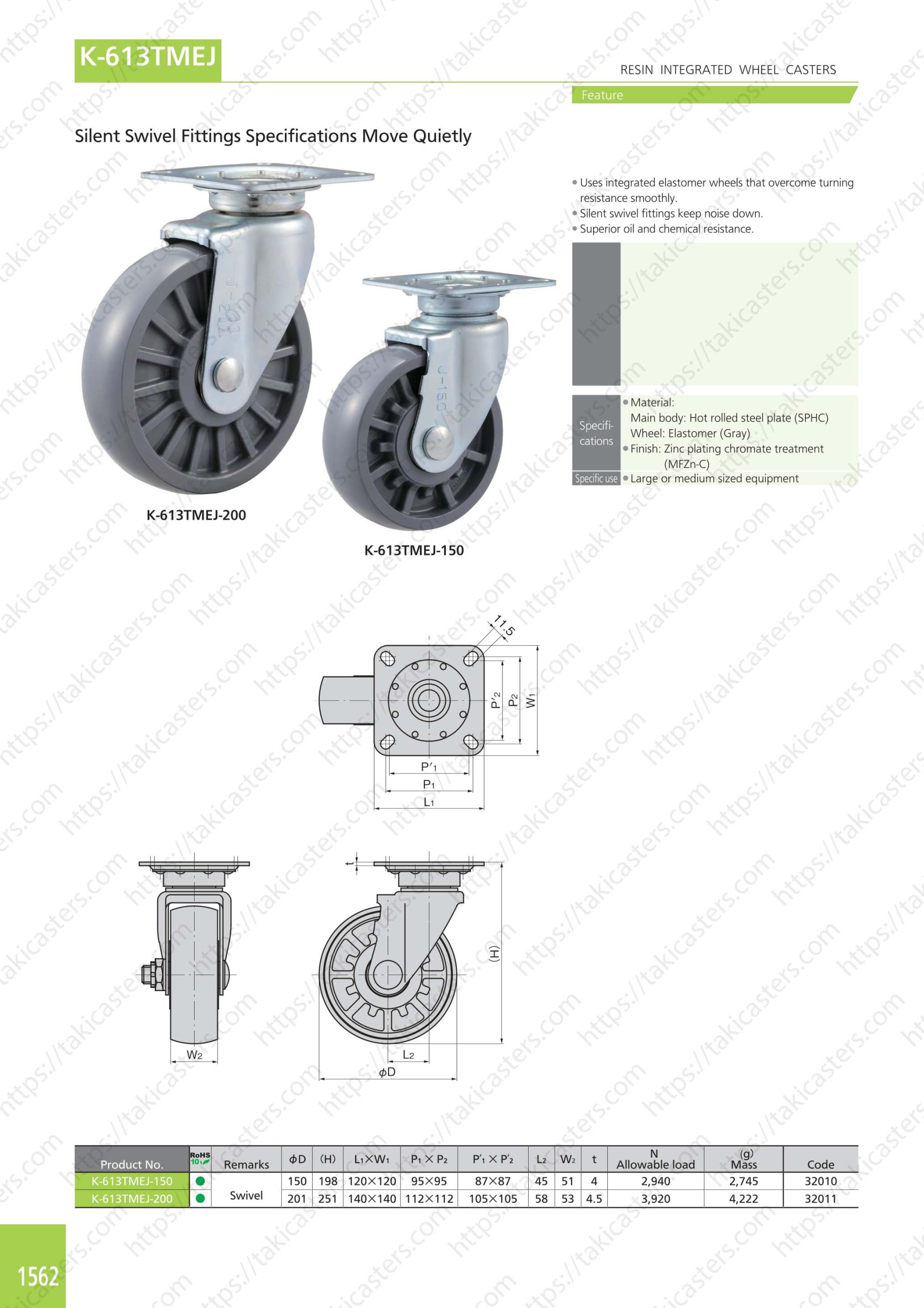 ●K-613TMEJ-150 : Bánh xe xoay/bánh xe đàn hồi φ150 (tải trọng cho phép 2940N), chiều cao 198 mm.